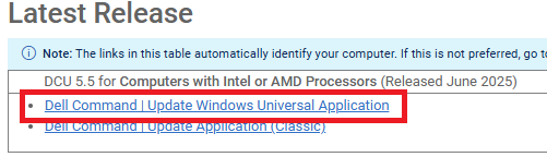 On the page, scroll until you see “DCU 5.5 for Computers with Intel or AMD Processors.” It is very important that you choose this section only. Under it, click on: Dell Command | Update Windows Universal Application.