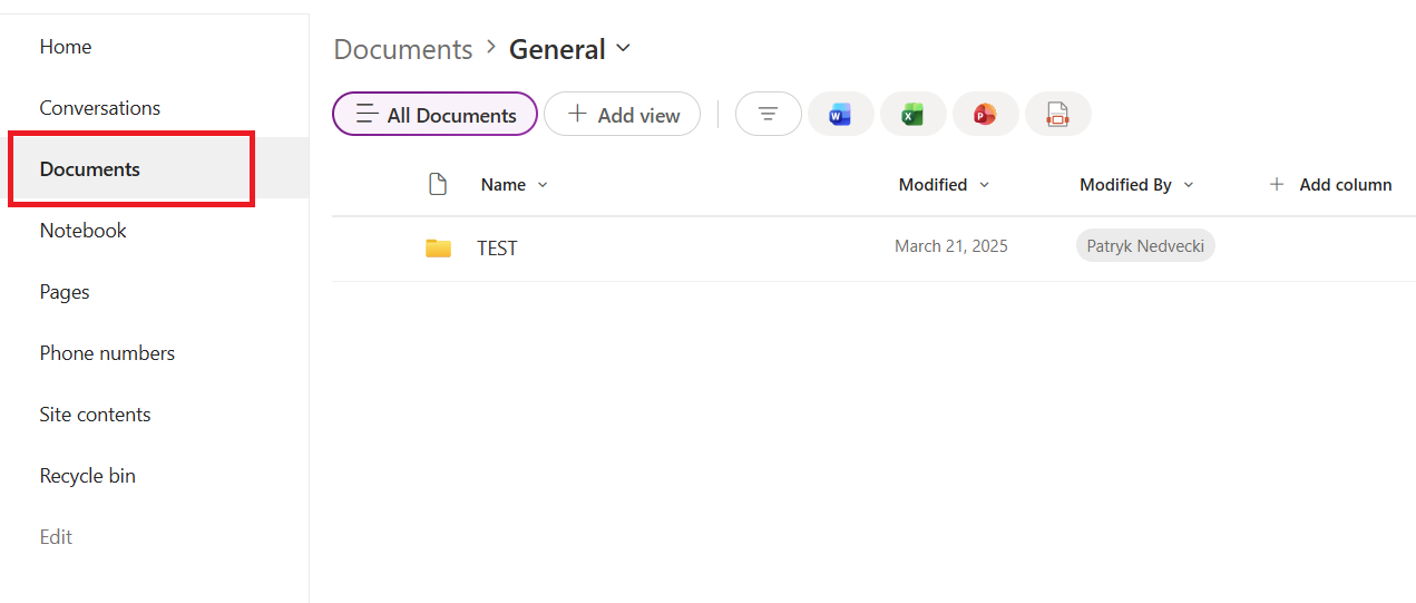 From the navigation menu, select 'Documents' to view the shared documents area of the SharePoint site: